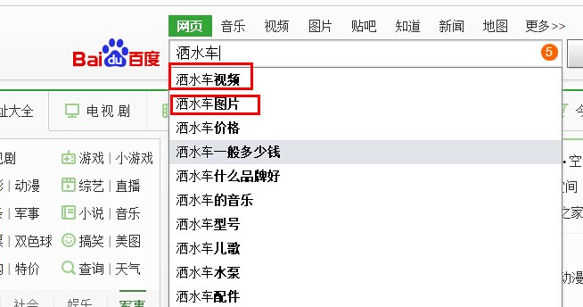 我們做排名的時候都必須要分析用戶的需求,比如用戶搜索近期正在熱播的中國好聲音,用戶最想看的是直播,所以我們做直播滿足了用戶需求。這樣說的意思是,中國好聲音是主關鍵詞,如果你想把這個詞做起來,你就必須要做直播。以此類推,我們也可以運用在我們網站上,以我公司的網站為例,我們要做的關鍵詞是灑水車,通過相關搜索我們可以發現,我們做灑水車最大的需求是灑水車視頻和灑水車圖片,請看下圖: