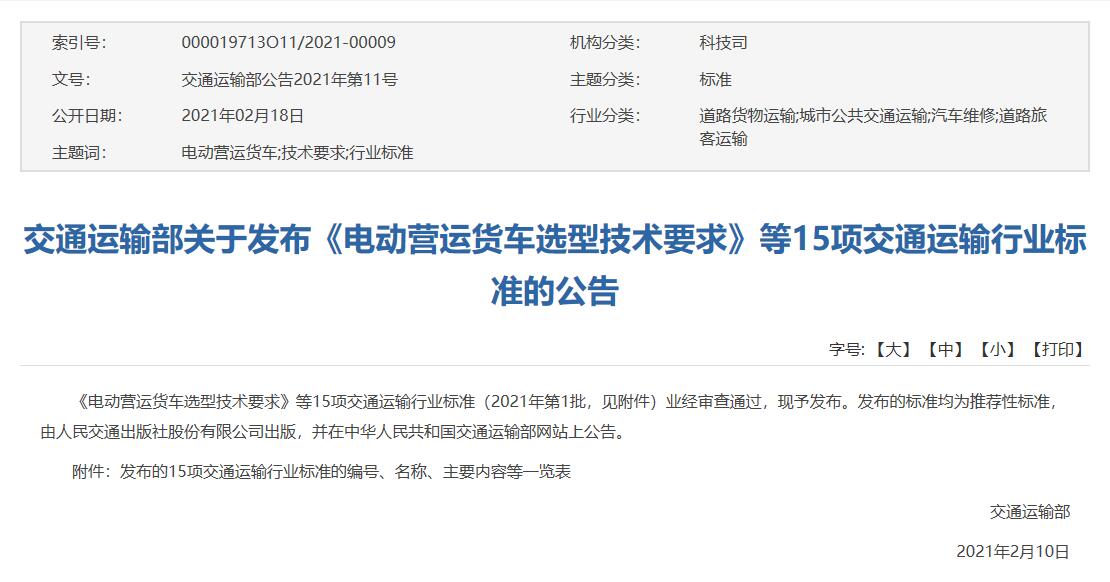 交通運輸部關于發布電動營運貨車選型技術要求等15項交通運輸行業標準的公告